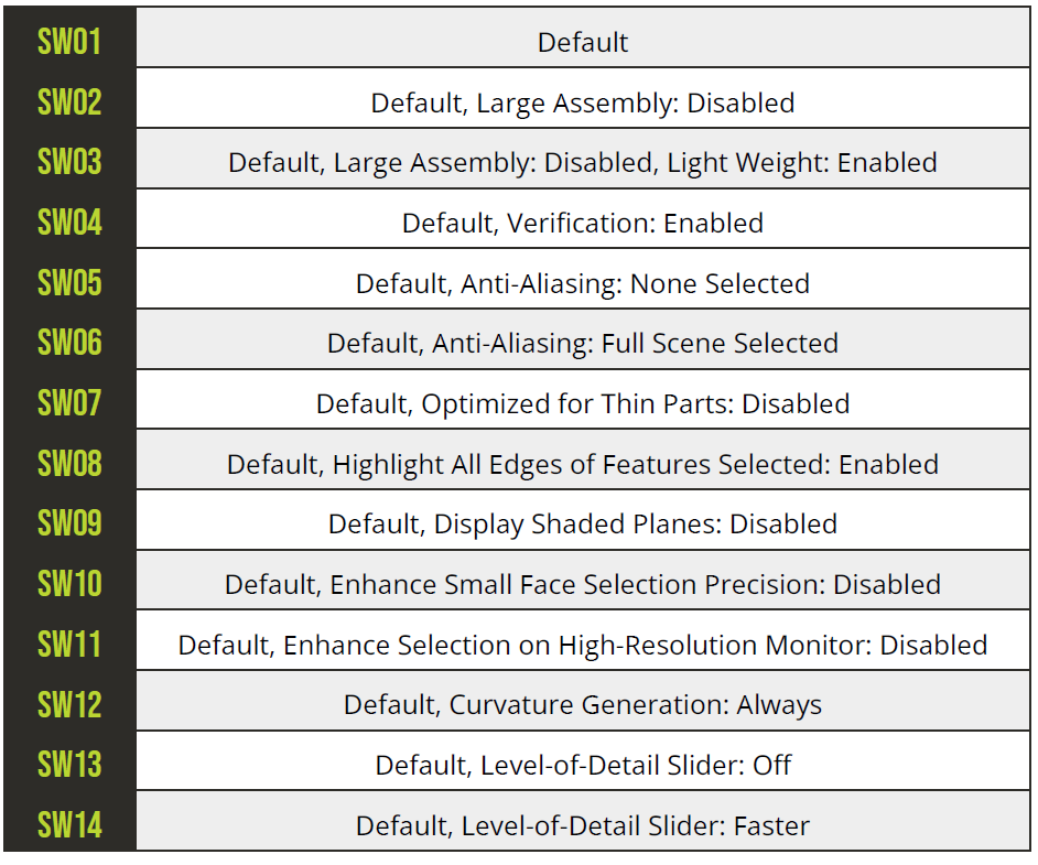The test operations include opening and saving assemblies, Pack and Go, assembly and part creation, and many other daily operations SOLIDWORKS users perform. This test is typically dependent on the CPU’s single-thread performance. SOLIDWORKS settings can greatly impact the results, so, when we conduct the full battery of tests, we run the GoEngineer Standard Benchmark in 14 settings configurations: