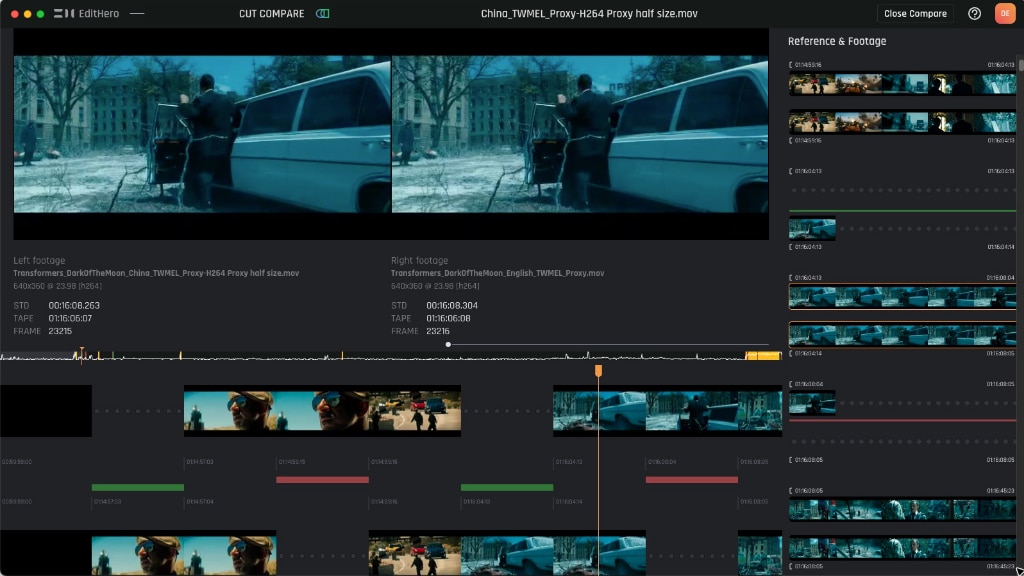 Under the hood, EditHero uses perceptual hashing to generate a fingerprint of every frame, then combines it with machine learning-based matching to align sequences across formats, resolutions, and reframes without needing timecodes or metadata.