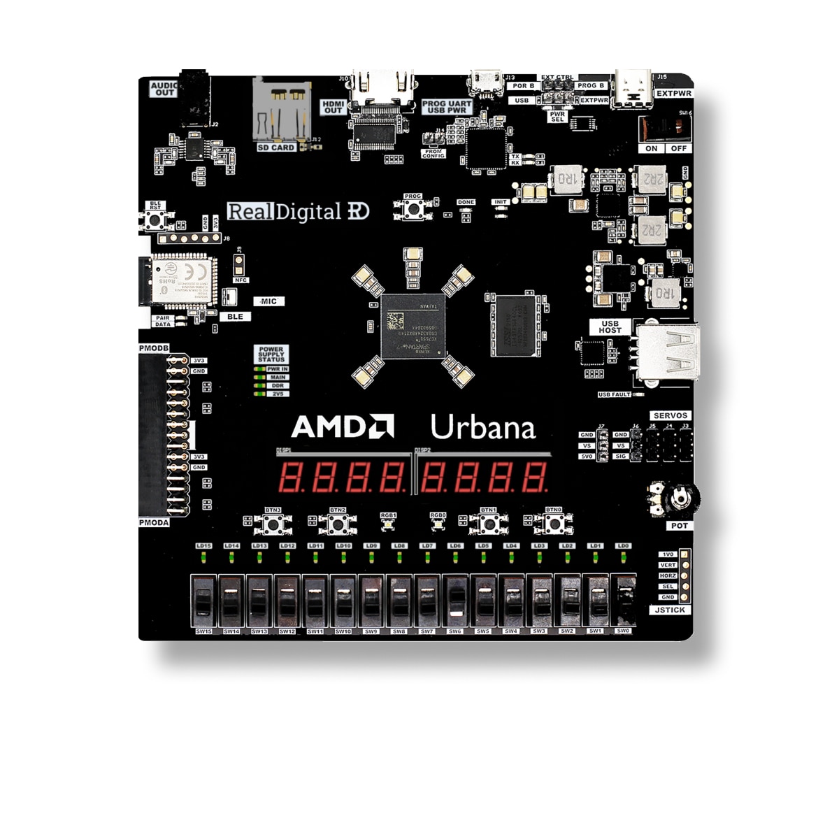 The Urbana board is an FPGA-based educational platform designed to host a wide range of digital systems and microprocessor IP/core designs. Based on AMDs Spartan-7 FPGA, the Urbana board includes a 128Mbyte DDR3 memory, an SD card interface, a Bluetooth radio, a USB2 host, and many other features and devices. A free, full-featured version of AMD’s CAD tools can be used for design entry, simulation, synthesis, and FPGA programming, and a single USB connection provides power, a UART/COM port, and a programming port.