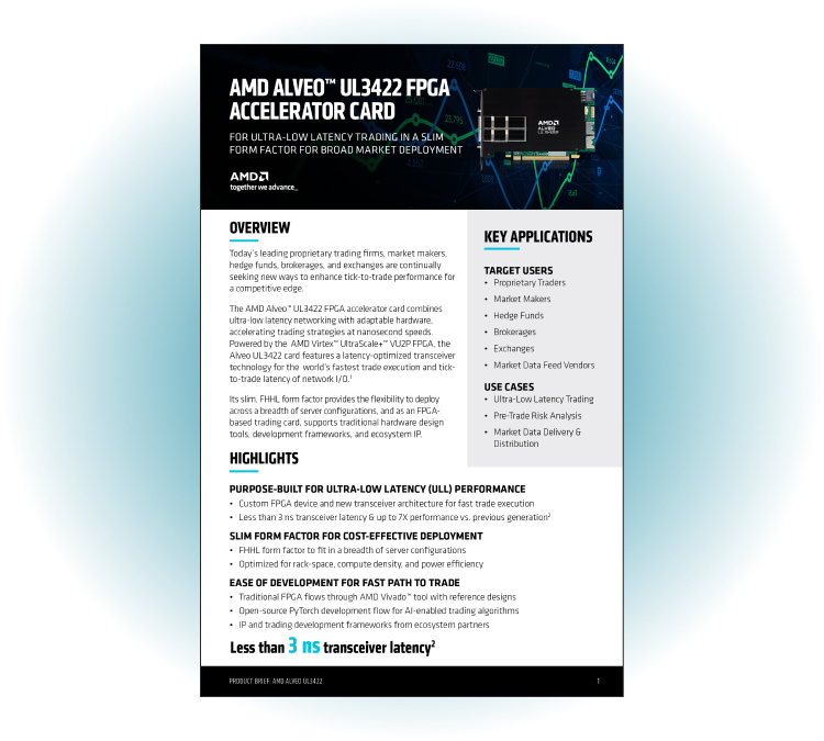 The AMD Alveo™ UL3422 accelerator offers ultra-low latency (ULL) trading in a slim form factor for cost-effective deployment.