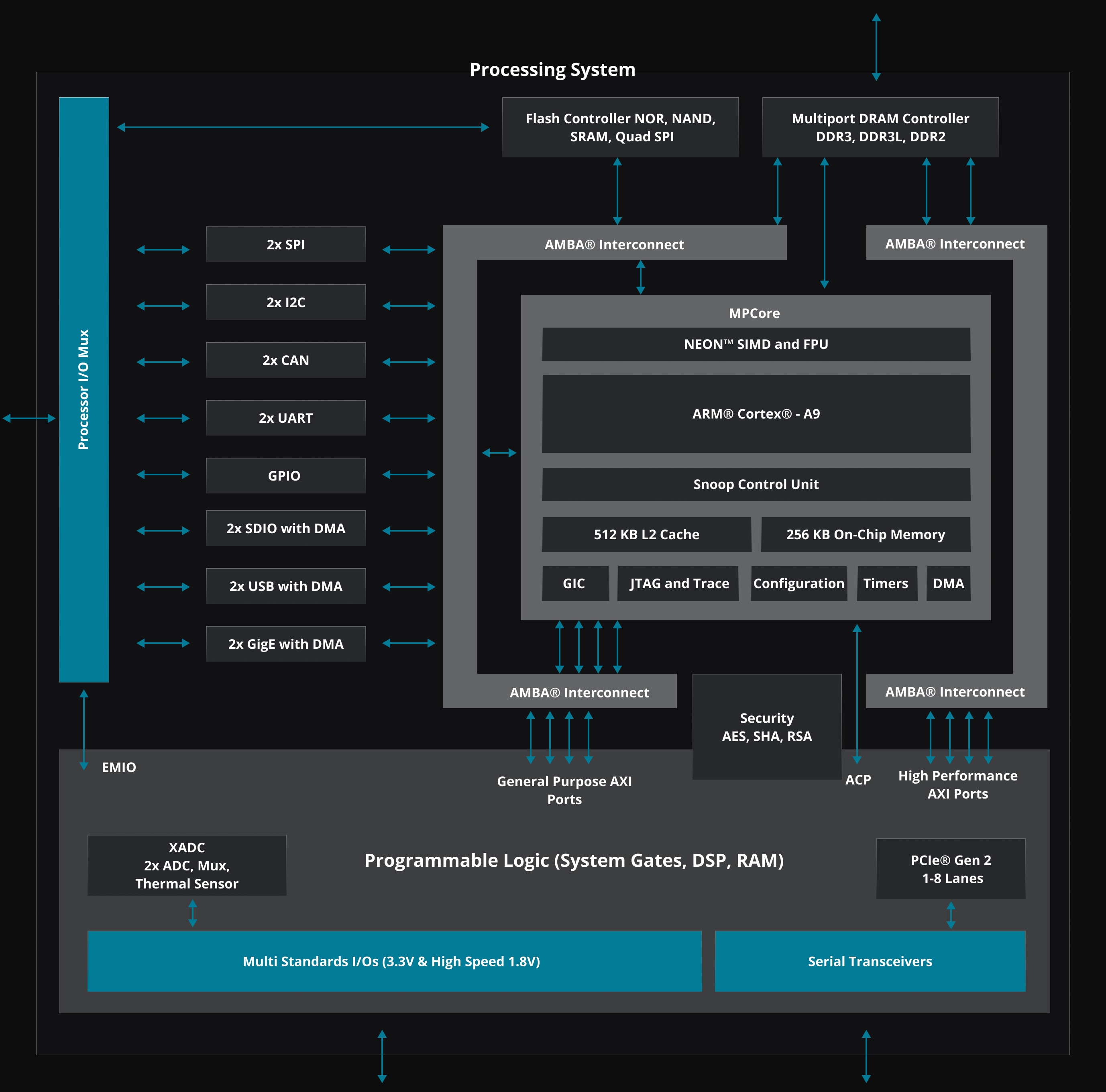 Zynq 7000 SoC devices are equipped with dual-core Arm Cortex-A9 processors integrated with 28 nm Artix 7 or Kintex 7 based programmable logic for excellent performance-per-watt and maximum design flexibility. With up to 6.6M logic cells and offered with transceivers ranging from 6.25 Gb/s to 12.5 Gb/s, Zynq 7000 devices enable highly differentiated designs for a wide range of embedded applications including multi-camera drivers assistance systems and 4K2K Ultra-HDTV.
