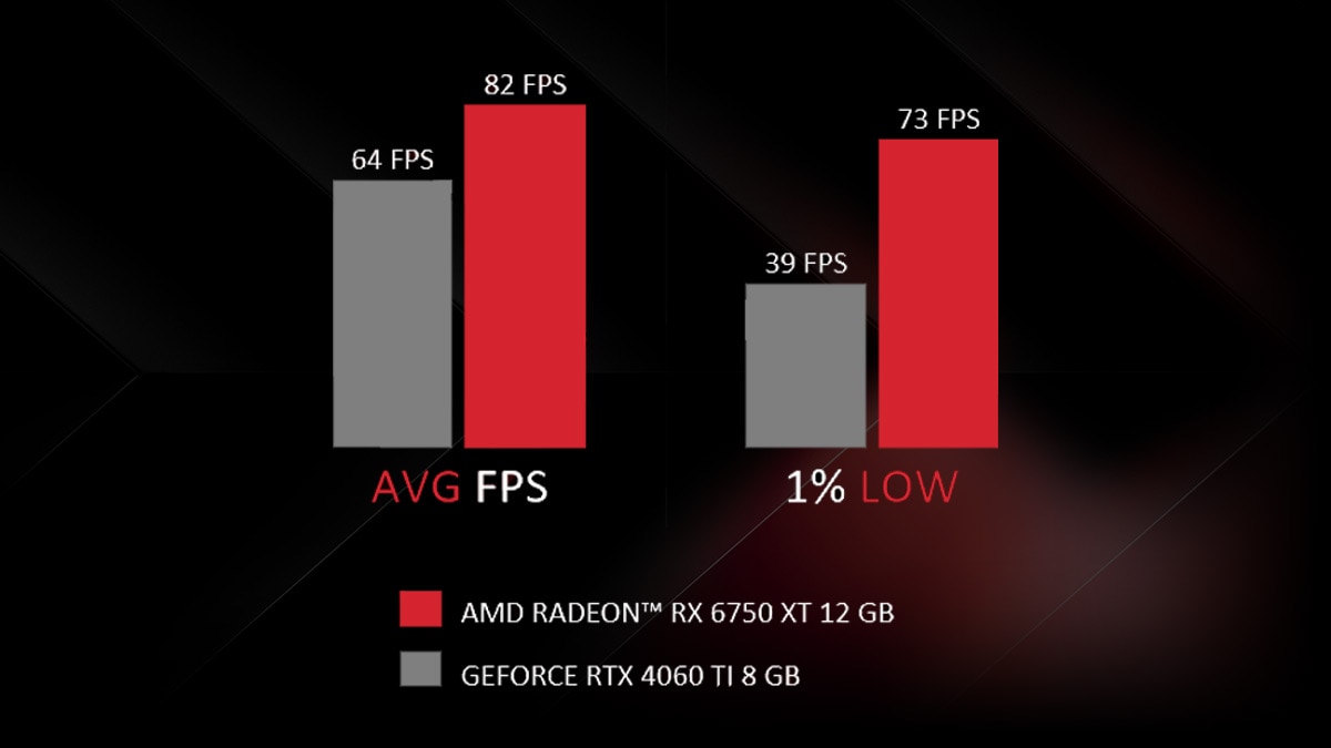 - Testing by AMD as of May 16, 2023, on AMD Radeon™ RX 6750 XT (12GB) graphics card with AMD Software Adrenalin Edition 23.4.3 driver, versus RTX 4060 Ti (8GB) with driver 531.79 on a test system with AMD Ryzen™ 9 7950X3D, 32GB DDR5-5200M/T, X670 Ace MSI motherboard, and Windows 11 Pro 10.0.22621, using Far Cry 6 at 1440p, Ultra settings with raytracing “High” enabled. System manufacturers may vary configurations, yielding different results. RX-946